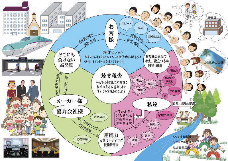 また、私たちと共に働くみんなが、パートナーとして切磋琢磨しながら協力し、連帯感を持ち、明確な夢と希望に向かって、勇気と自信を持ち、具体的に実践、行動することによって、生きがいや働きがいが得られるような、豊かな心を求め続けます。